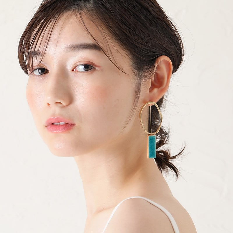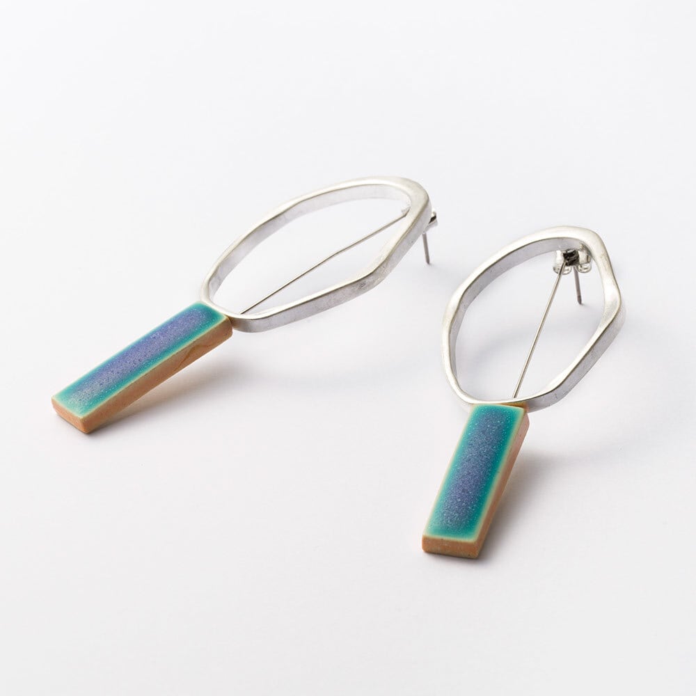 MIKELOオリジナル陶器 信楽 揺れるフープピアス スクエア ターコイズブルー×シルバー